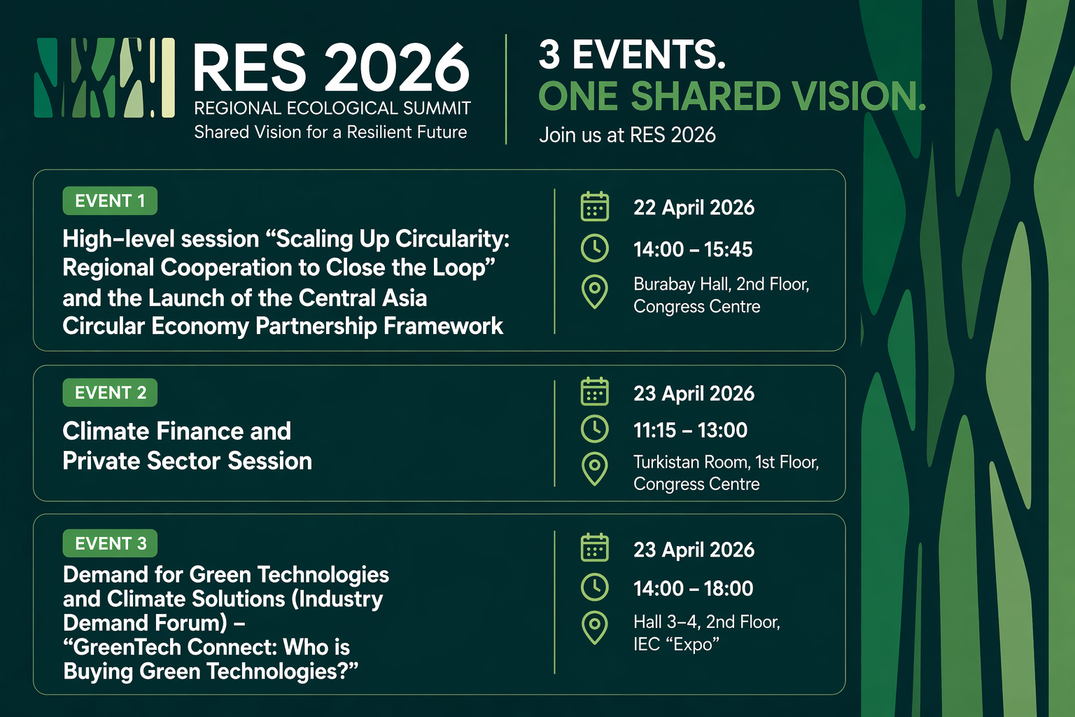 The Regional Ecological Summit 2026 (RES 2026) will take place from 22 to 24 April 2026 in Astana, Kazakhstan, representing a landmark moment for environmental cooperation in the region. Convened under the theme "One Region, One Vision, One Future" and organized with the UN as a strategic partner, the summit is designed to transform political commitment into tangible, cross-border action on the climate crisis and broader ecological threats. By bringing together the governments of Central Asia with international organizations, businesses, and civil society, RES 2026 aims to forge a shared agenda for sustainable development, with a particular focus on identifying concrete green-financing needs, accelerating low-carbon technologies, and strengthening environmental resilience across the region.
