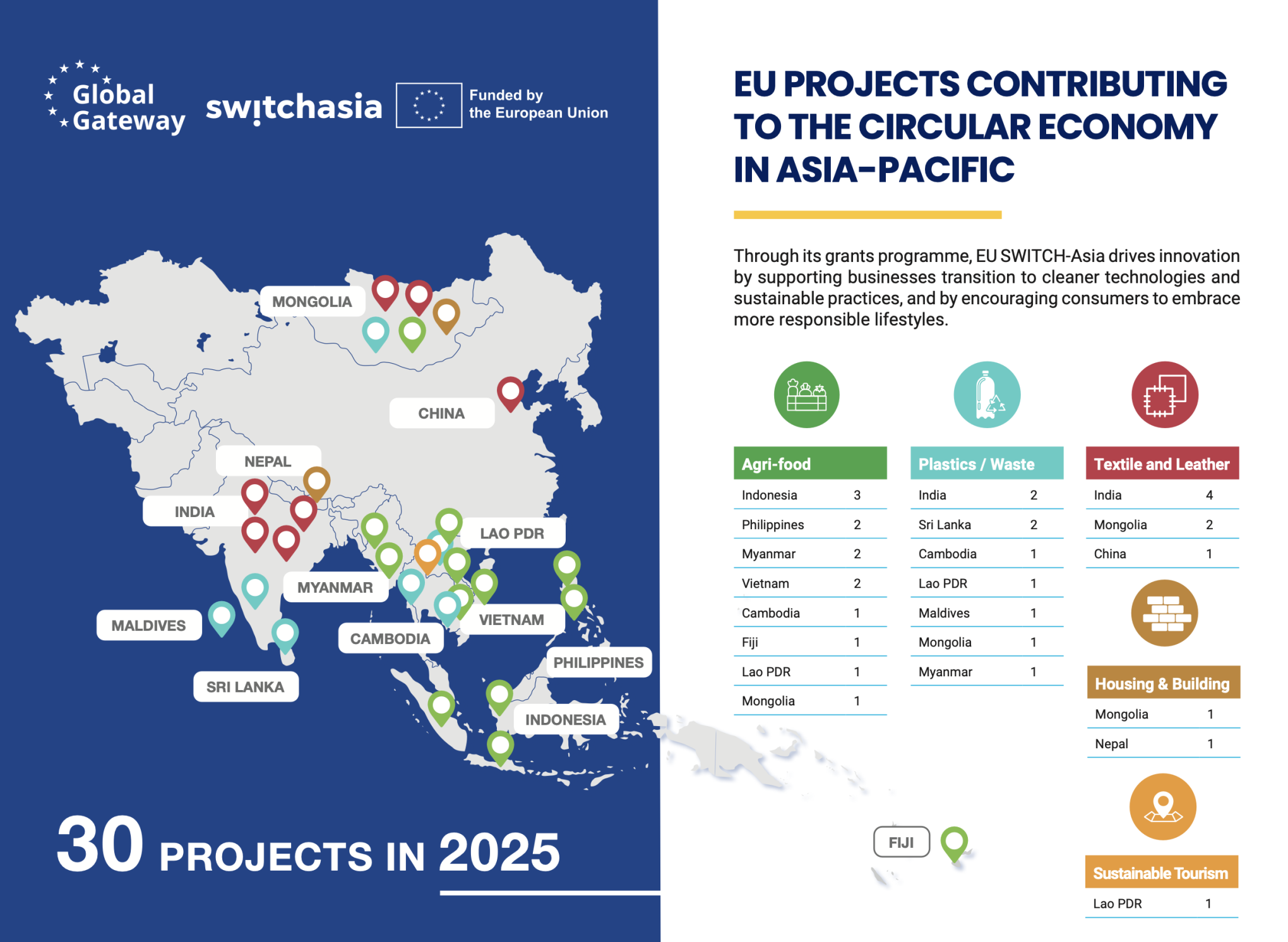 SWITCH-Asia Grants Programme funds pilot projects helping companies to adopt cleaner technologies and more sustainable industrial practices, as well as helping consumers to act more responsibly in their daily choices and lifestyles. Since 2007, this EU programme has funded projects across a wide range of sectors (energy efficiency in industrial plants and houses, agri-food and fishing sectors, textiles and leather, tourism, logistics and freight) implemented by over 500 Asian and European partners, about 100 private sector associates, indirectly benefitting up to 80.000 micro, small and medium-sized enterprises (MSMEs). In 2023, the programme has been extended to the Pacific.