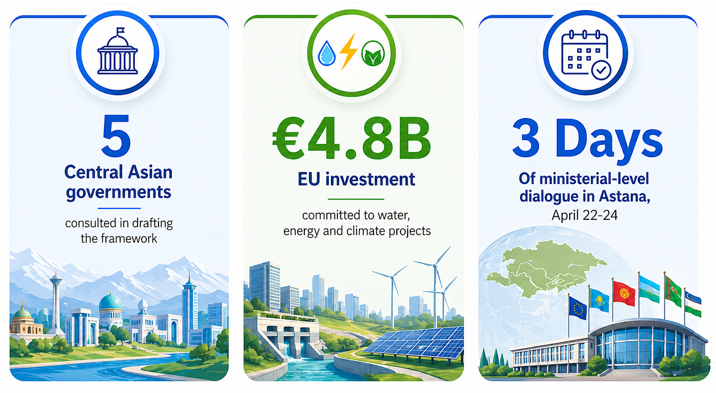 - The EU-Central Asia High-Level Meeting on Water, Energy and Climate Change was convened as part of the Team Europe Initiative on the sidelines of the RES26. With the EU committing up to €4.8 billion to concrete regional projects, the meeting reaffirmed that water security, the green energy transition, and climate resilience are inseparable challenges, and that no single country in the region can solve them unilaterally.